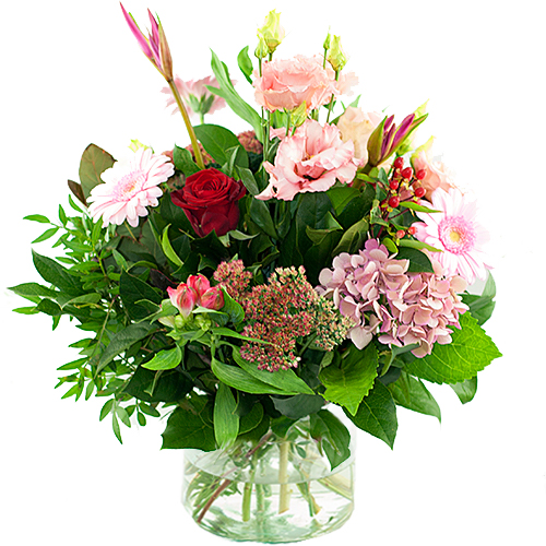 Seasonal bouquet pink red, with flowers of this season. Our flower binders turn it into a spectacle, ideal as a thank you or as a support.