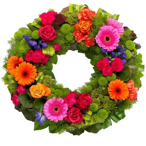 Funeral wreath ajour colored. Decorated with striking colored flowers, wreath of about 50 cm. Goodbyes don’t always have to be subdued.