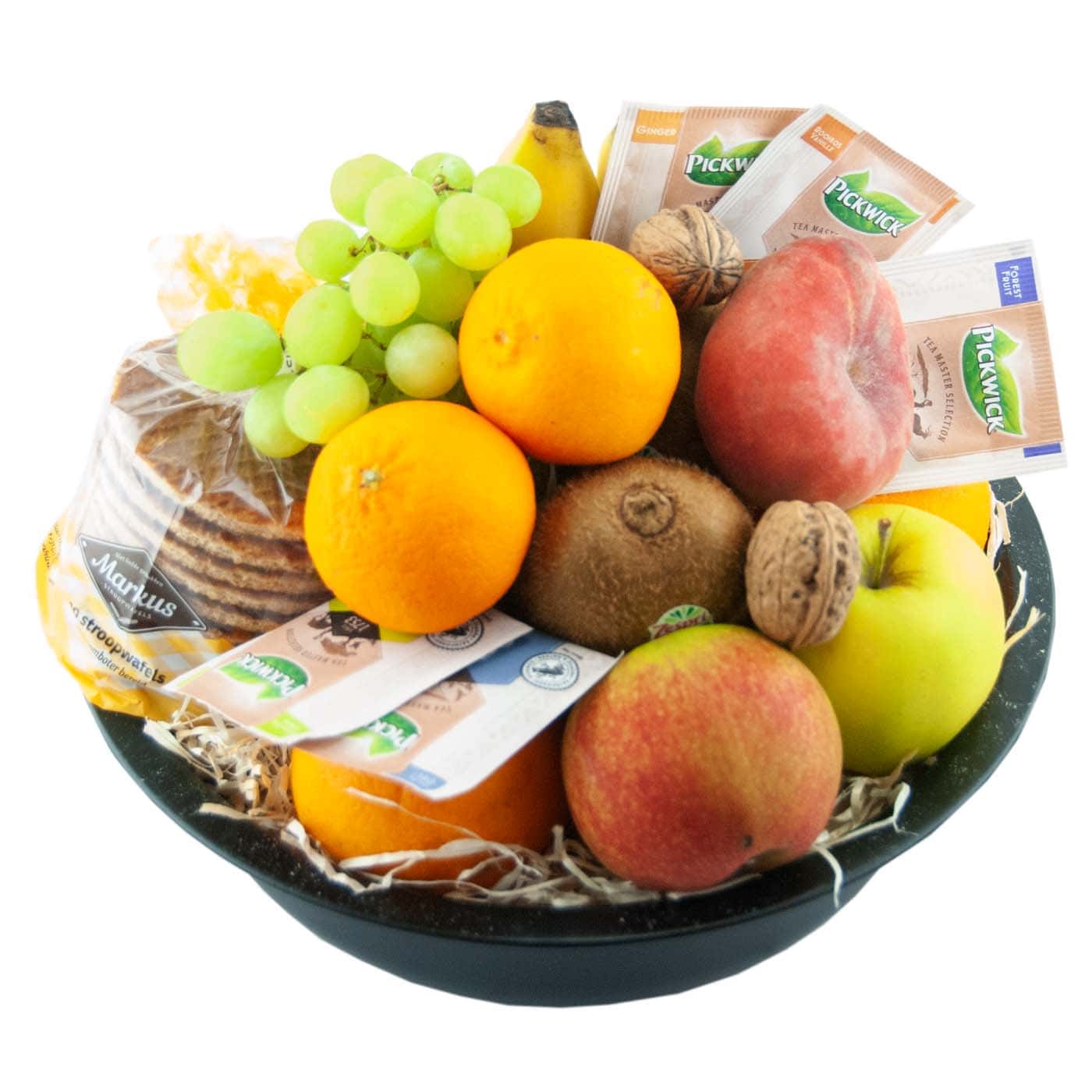 Fruit basket 30cm seasonal fruit tea and cookie