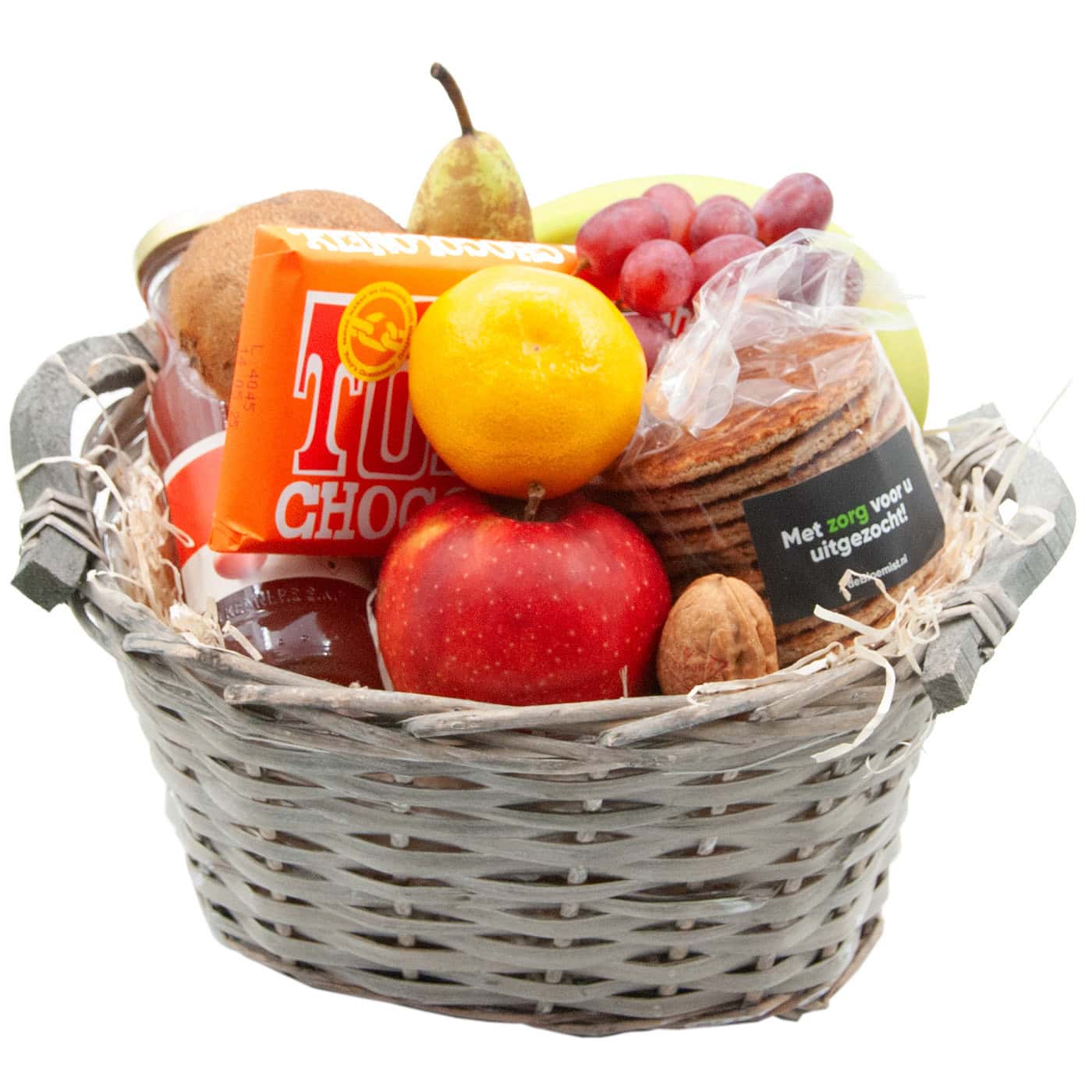 Small delicacy, basket of fruit and delicacies. In addition to a few pieces of fruit, this basket also contains a pack of syrup cookies, a large bar of Tony Chocolonely chocolate and a small bottle of fruit juice. Always delicious fresh fruit, carefully selected for you!