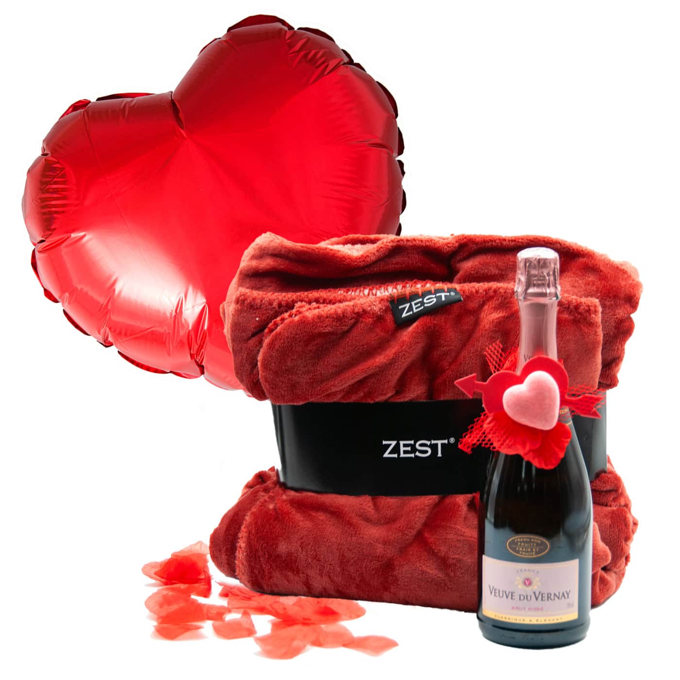 Zest moment of enjoyment, a gift for a wonderful moment of enjoyment on the couch, bottle of Veuve du Vernay rosé with a heart balloon filled with helium and a wonderfully soft blanket from Zest. Quality blanket Zest with fur on the inside, dimensions 130cm by 160cm