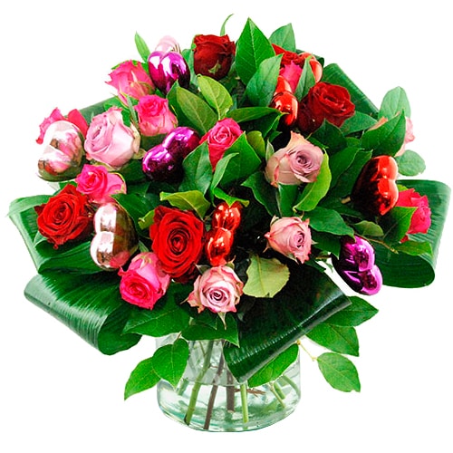 Valentine bouquet of roses mix red pink lilac is hand-tied by a local professional florist.