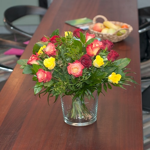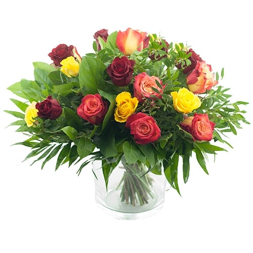 Bouquet of red yellow and orange roses, this bestseller is hand tied by a local professional florist.