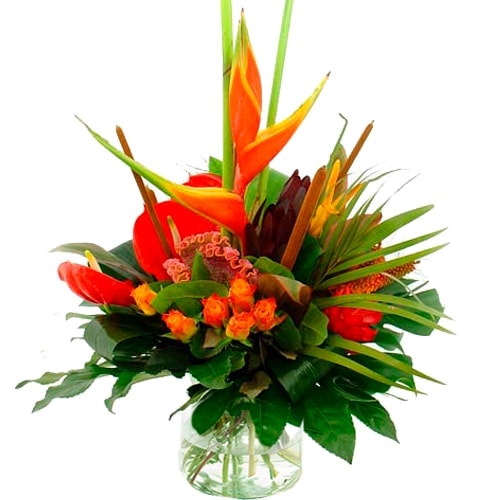 Tropical bouquet of as many unusual flowers as possible. An eye-catching bouquet, a good choice if you really want to give away something special.