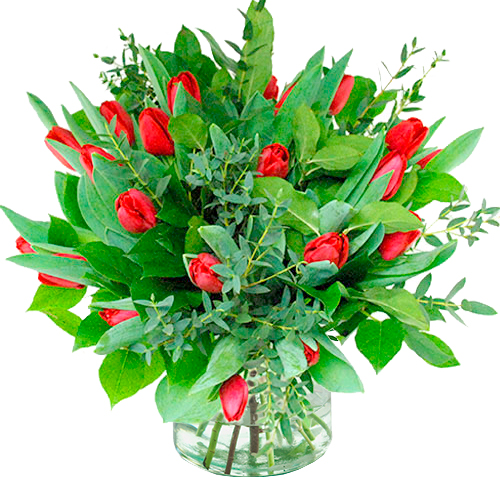 This bouquet of red tulips is hand-tied by a local professional florist.