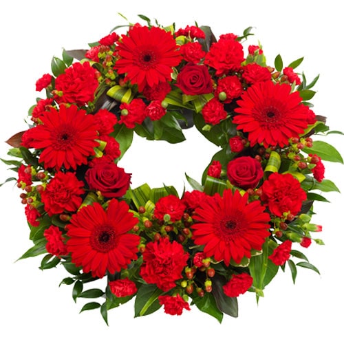 Funeral wreath Ajour red with beautiful red flowers, wreath of about 50 cm. Red symbolizes love and beautiful memories.