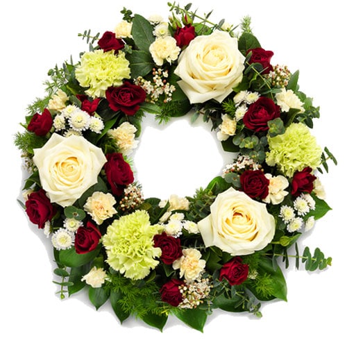 Funeral wreath ajour red white. Funeral wreath Ajour with red and white flowers, wreath of about 50 cm