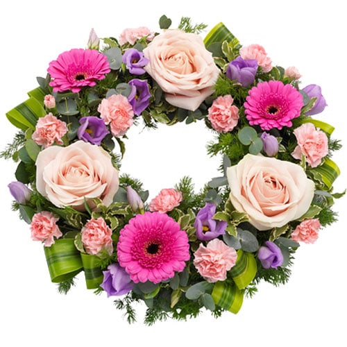 Funeral wreath ajour pink lilac, our funeral arrangements are made with the utmost care by a local professional florist.