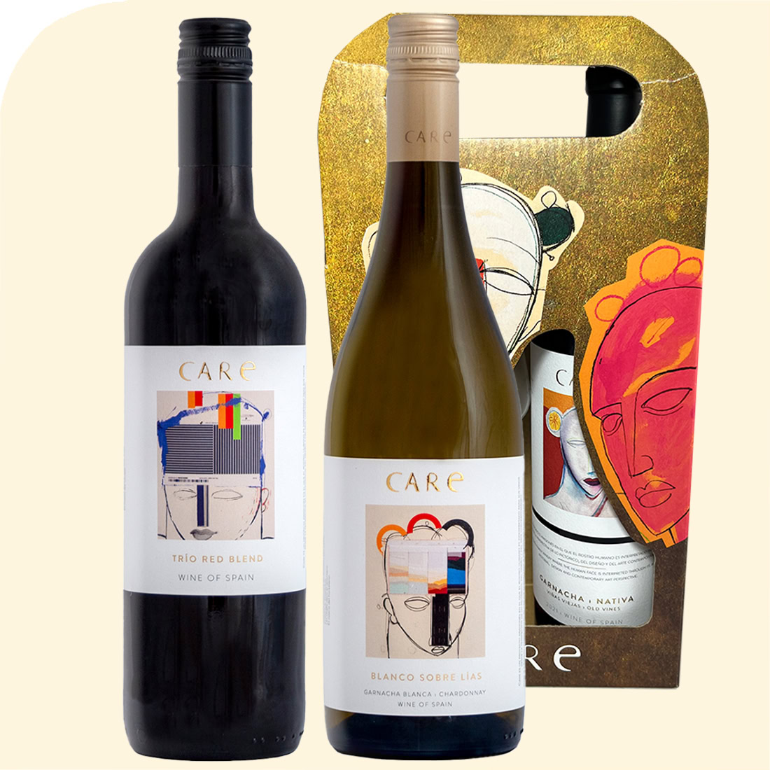 Care Wine Duo – Red & White – Two Spanish wines in a stylish gift box. A stylish wine gift from Spain with two characterful wines from Bodegas Care. This duo combines the full-bodied, fruity Care Trio Red Blend with the fresh and creamy Care Blanco Sobre Lías. Together they make the perfect gift for any wine lover.