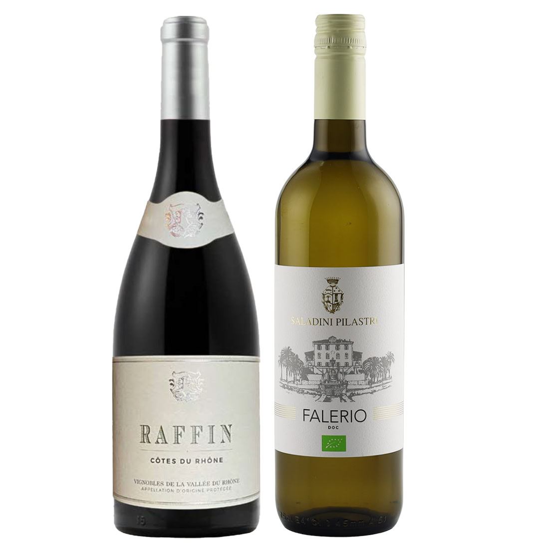 organic wine combination. Enjoy or surprise someone with this elegant organic wine duo! This set features a refined Raffin Côtes du Rhône red wine and a fresh organic Falerio DOC white wine. A perfect gift for wine lovers, ideal for celebrations, dinner parties or simply a cozy night in.