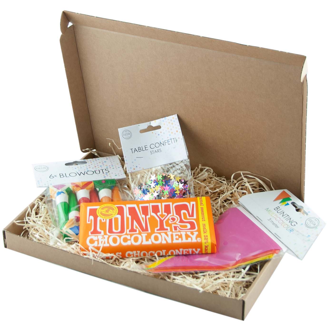 Tony’s Chocolonely Party box, chocolate bar of 180 grams, bag of confetti, party flags 3 meters and 6 party whistles. Always a nice gift!