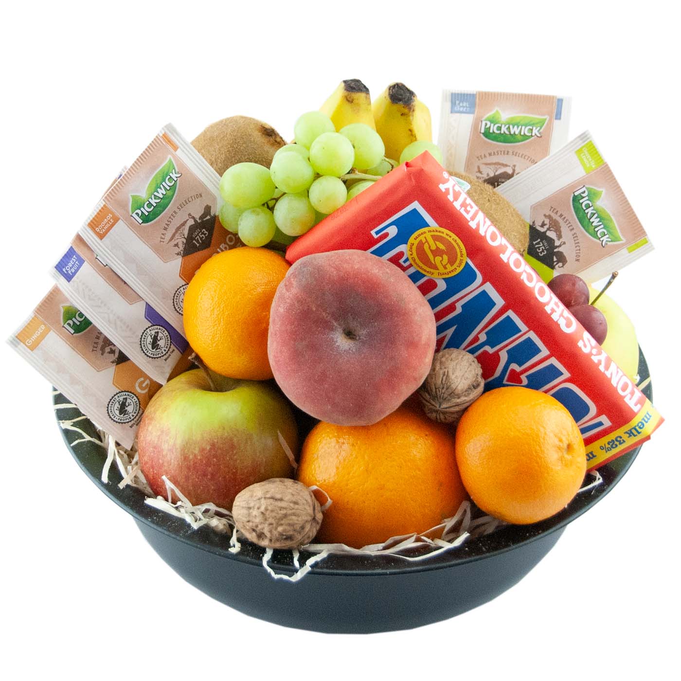 fruit-basket with tea tonys chocolonely, our fruit baskets are put together by our fruit specialist just before we send them to the recipient.