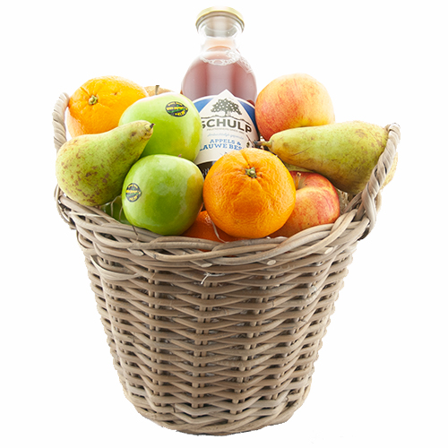 Fruit basket full of picked fruit and juice, our fruit baskets are put together by our fruit specialist just before we send them to the recipient.