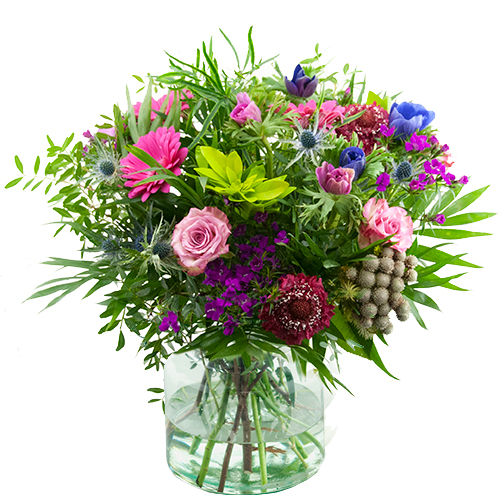 A bouquet of soft spring colours, beautifully coordinated with each other. Various lilac, purple and blue spring flowers tied into a beautiful round bouquet. Suitable for many occasions such as a birthday, thank you or as a pat on the back.