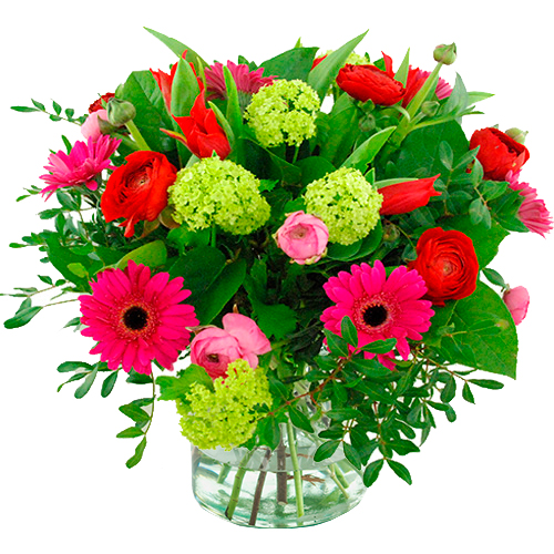 Our florists create a fantastic bouquet with the most beautiful pink, lilac and red spring flowers. Order a matching glass vase to make it a complete gift.