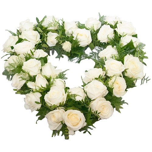 Open mourning heart with white roses, our funeral arrangements are made with the utmost care by a local professional florist.