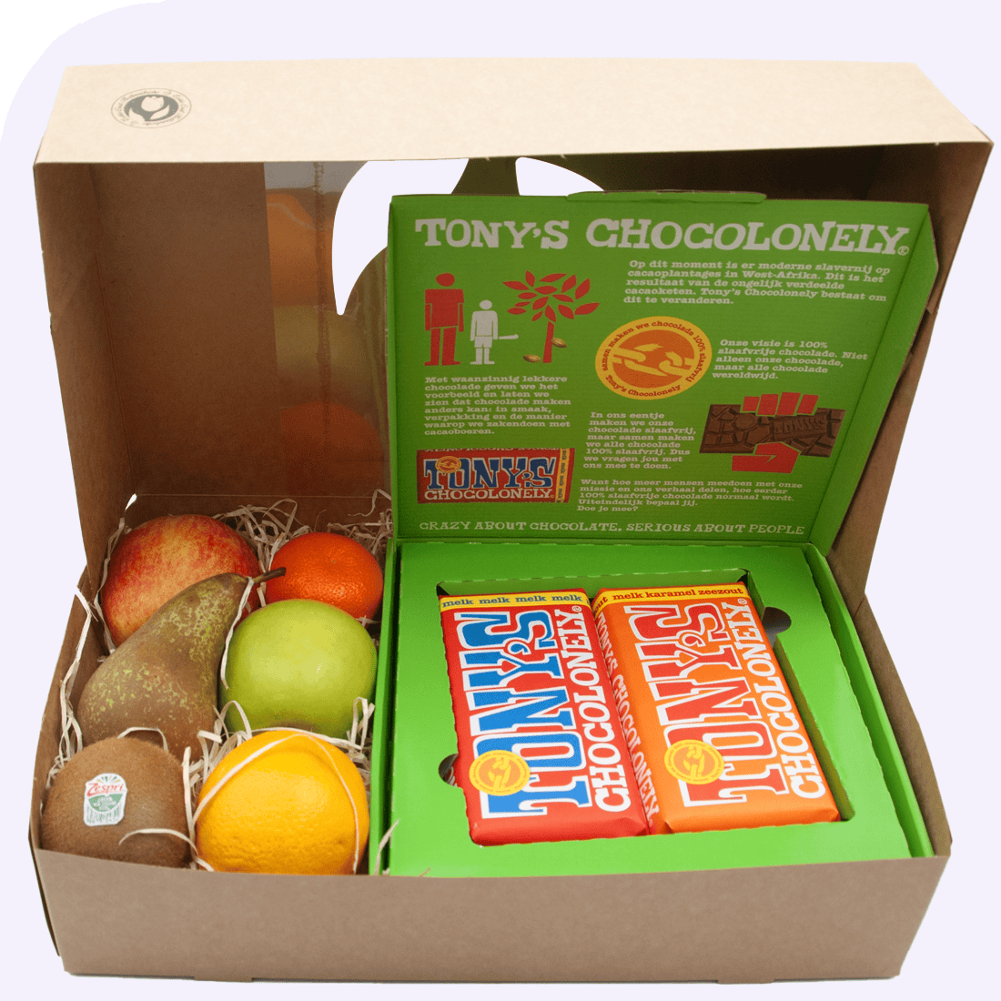 Fruit and Chocolate Treat Box. Surprise someone with a delicious combination of fresh fruit and ethically sourced chocolate. This gift box contains a selection of fresh fruit and two bars of Tony’s Chocolonely. The perfect gift for someone who needs a little extra energy or a boost—or just because, to make someone happy!
