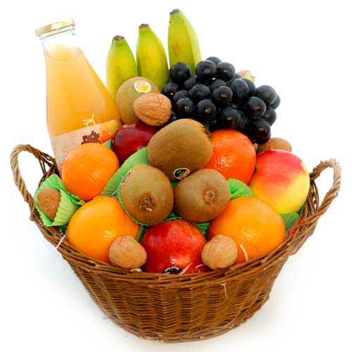 Basket of fruit with bottle of juice 75cl, our fruit baskets are put together by our fruit specialist just before we send them to the recipient.