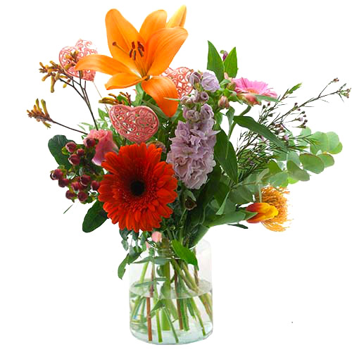 Mother’s Day palette bouquet pink orange is hand tied by a local professional florist.