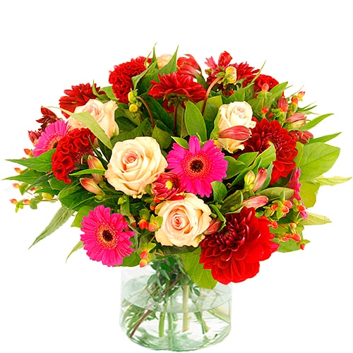 Autumn bouquet in pink and red tones, this bouquet contains a mix of autumn flowers in warm orange/red tones.