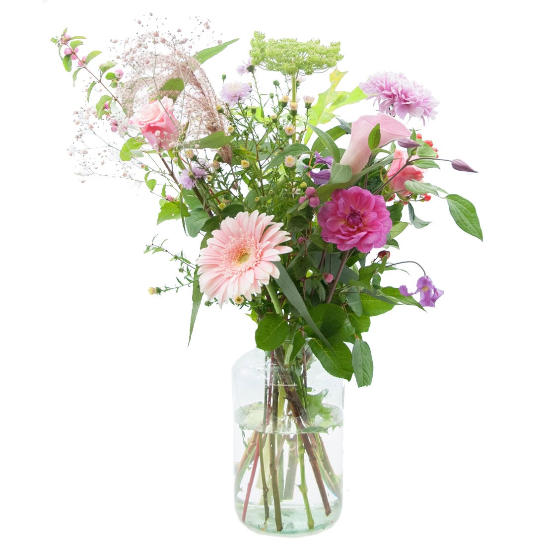 Mild fall autumn bouquet, bouquet of mainly pink flowers, carefully composed pick bouquet of well-matched autumn flowers with a few sprigs of green.