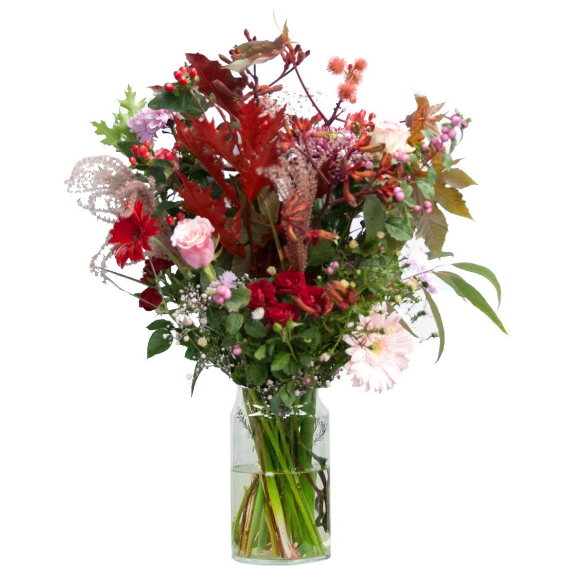 Flowery autumn, bouquet of the season in a beautiful color combination of pink, red tones, a beautiful combination of real autumn flowers.