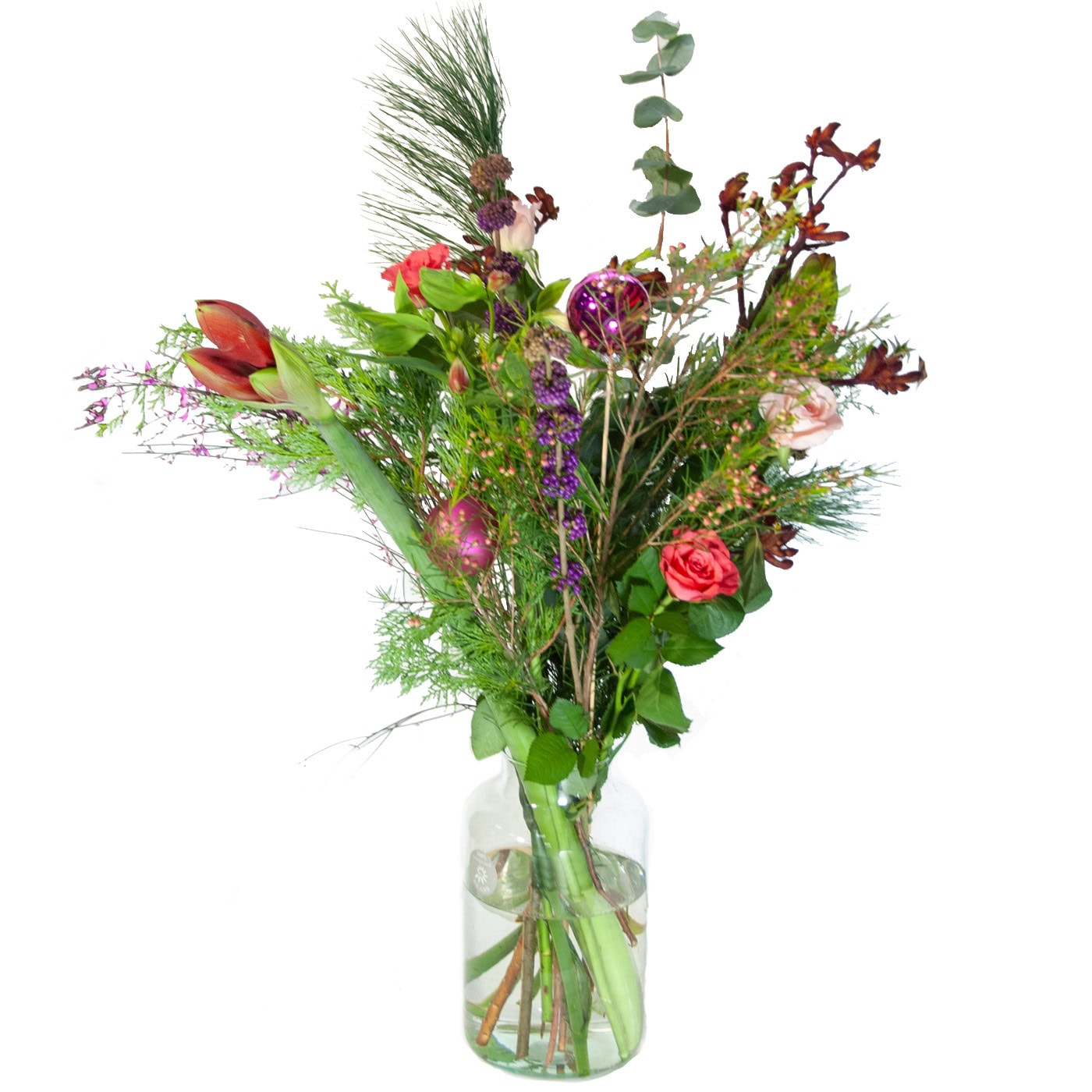 Cozy Christmas. Add warmth and color to your home with this cheerful Cozy Christmas Bouquet! A light and playful hand-tied bouquet featuring amaryllis, roses, and seasonal greenery a perfect blend of natural charm and festive elegance.  Always fresh flowers from the auction, tied by our flower binders.