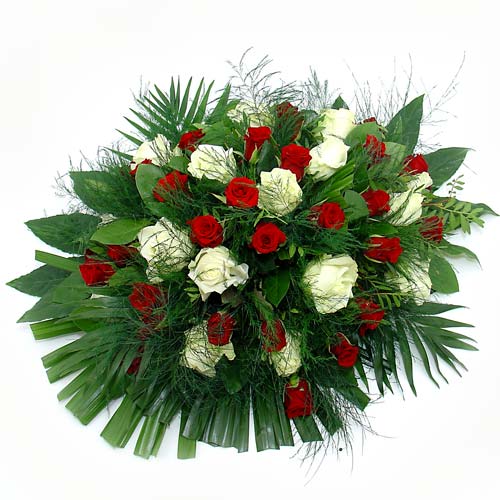 Funeral arrangement red and white roses