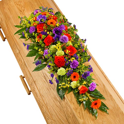Casket decoration bright colored, our funeral arrangements are made with the greatest care by a local professional florist.