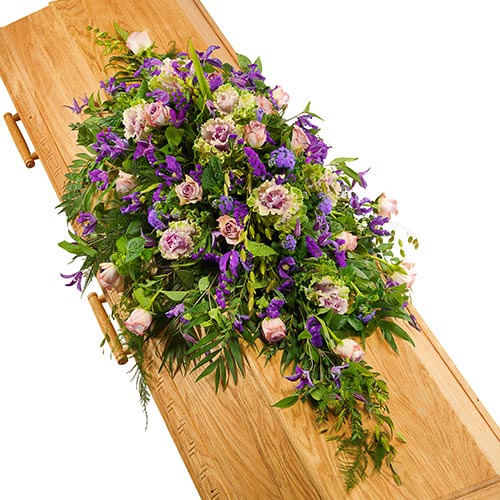 Coffin decoration lilac-purple, our funeral arrangements are made with the greatest care by a local professional florist.