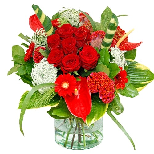 Red bouquet with a touch of white.A feast to receive and to give. Round tied bouquet with red roses in the middle. Suitable for many occasions such as a birthday, thank you or as a helping hand.