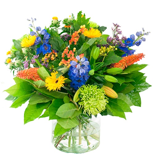 Autumn bouquet yellow orange blue, bouquet with real seasonal flowers hand-tied by a local professional florist.