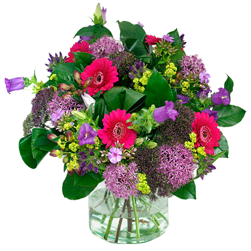Bouquet of purple late summer flowers, bouquet with real seasonal flowers, hand-tied by a local professional florist.