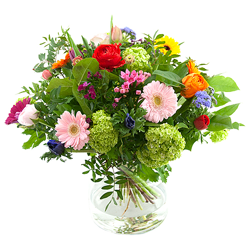 One of our bestsellers, this cheerful spring bouquet is a joy to receive. It makes you happy, various flowers in all kinds of colors tied into a round bouquet.